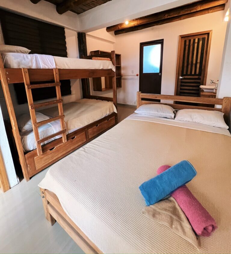 – 3 literas de 1 1/2 habitaciones plazas – Baño privado – Agua caliente – Wifi – Ventilador – Lockers – Balcón